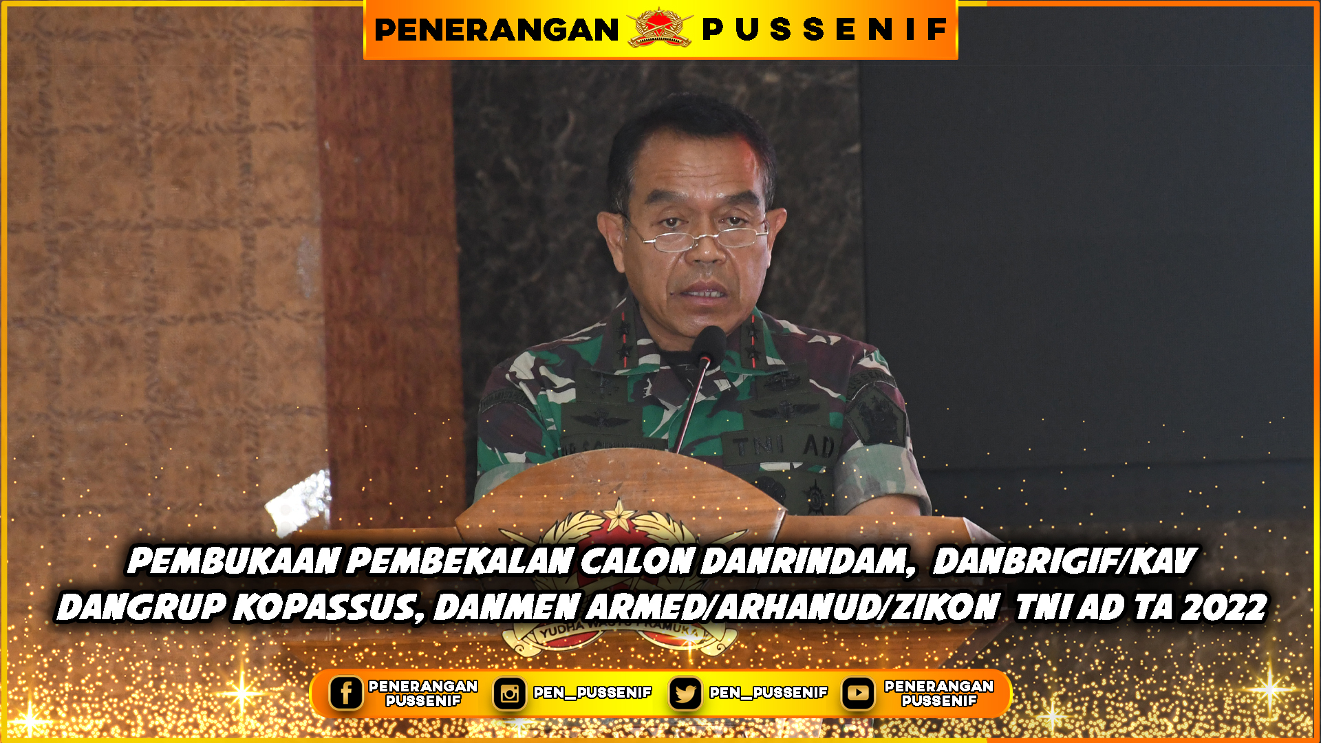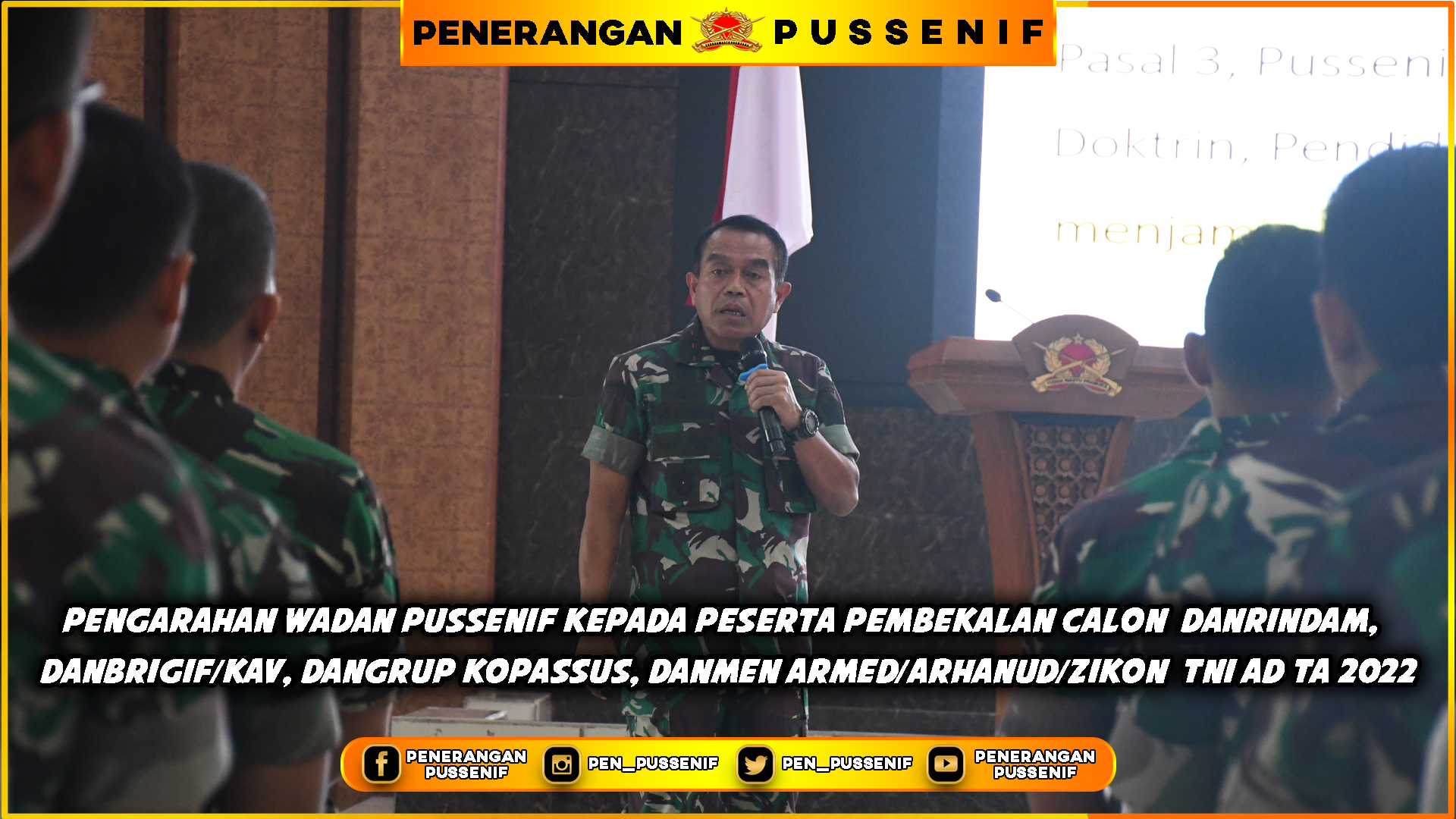Bandung. Sebanyak 38 orang peserta Pembekalan Calon Danrindam, Danbrigif/Kav, Dangrup Kopassus, Danmen Armed/Arhanud/Zikon TNI AD TA 2022 menerima pengarahan dari Wakil Komandan Pusat Kesenjataan Infanteri Mayjen TNI Asep Setia Gunawan, S.I.P. di Gedung Graha YWP Pussenif. Senin (13/06/2022).