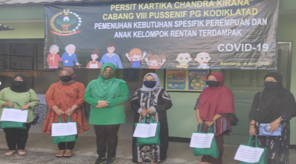 Wakil Ketua Persit Kartika Chandra Kirana (KCK) Cabang VIII Pussenif PG Kodiklatad Ny. Intan Daniel Chardin secara langsung memberikan bantuan pemenuhan kebutuhan spesifik perempuan dan anak rentan terdampak Covid-19