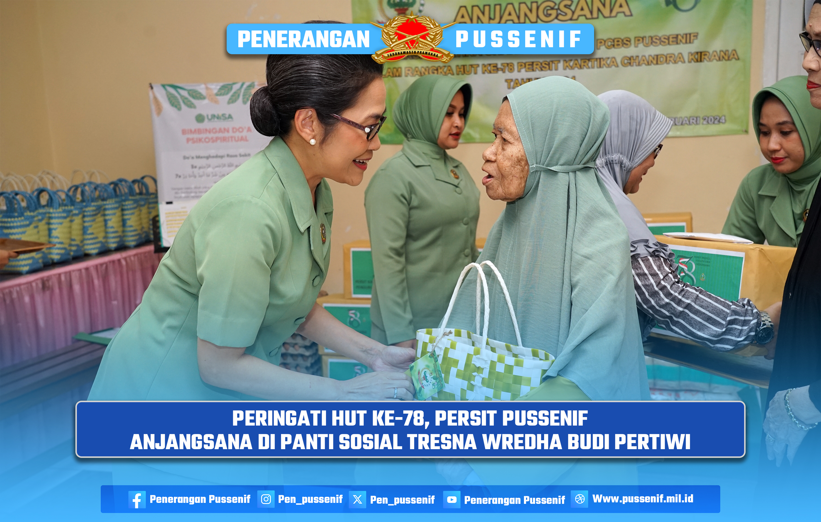Dengan pertimbangan diatas, serta dalam rangka memperingati HUT Persit ke-78 tahun 2024, ketua Persit KCK cabang BS Pussenif Ny Yani Anton Nugroho bersama pengurus mengunjungi Panti Sosial Tresna Werdha Budi Pertiwi, di Jalan Sancang No. 2 Burangrang, Kec. Lengkong Kota Bandung, Selasa (27/02/2024).