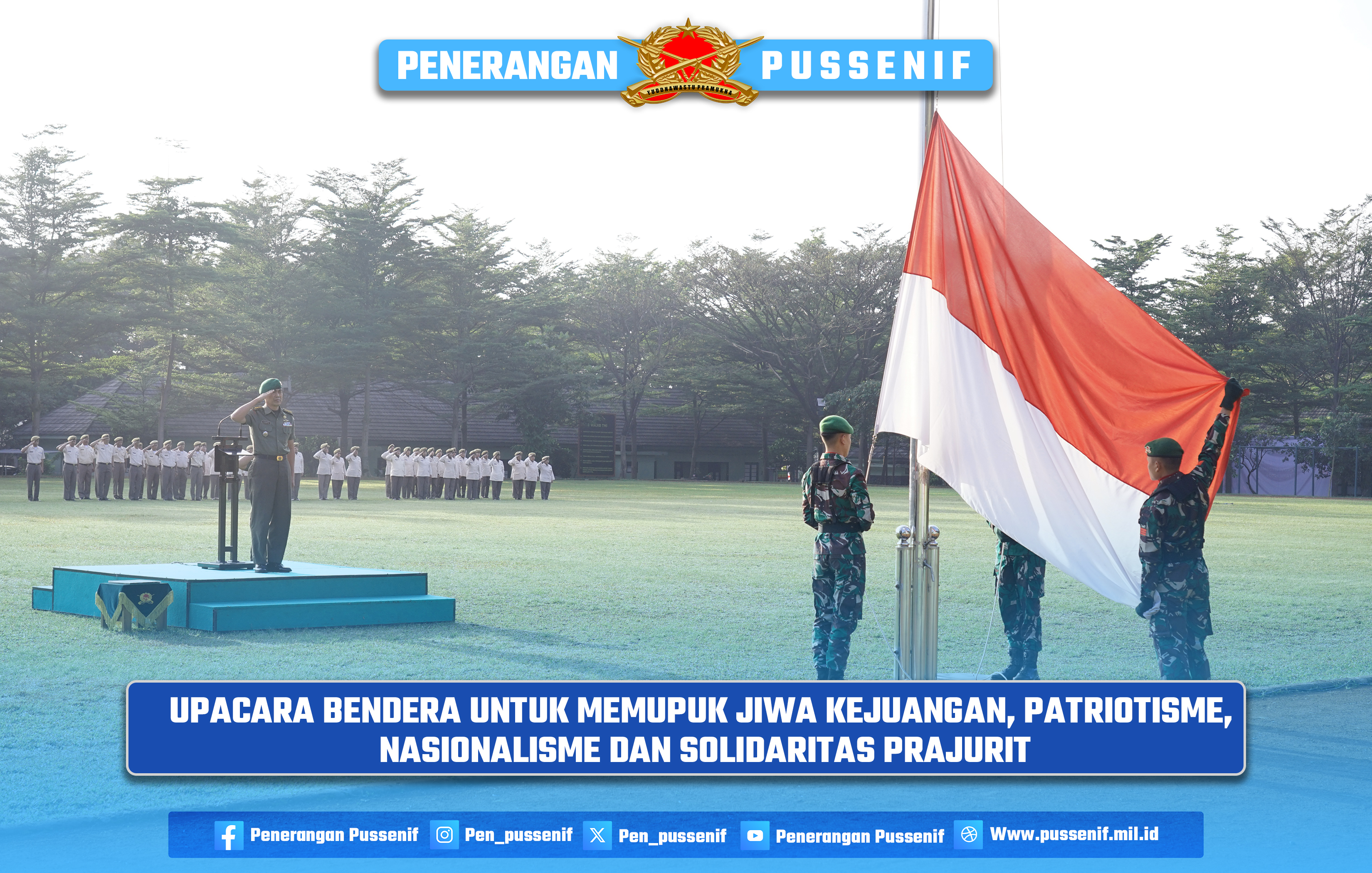 Adapun yang bertindak sebagai inspektur upacara yaitu Dirbindok Pussenif Kol Inf Sunarto. Upacara Bendera ini diikuti oleh seluruh Perwira, Bintara dan Tamtama serta Pegawai Negeri Sipil Pussenif.