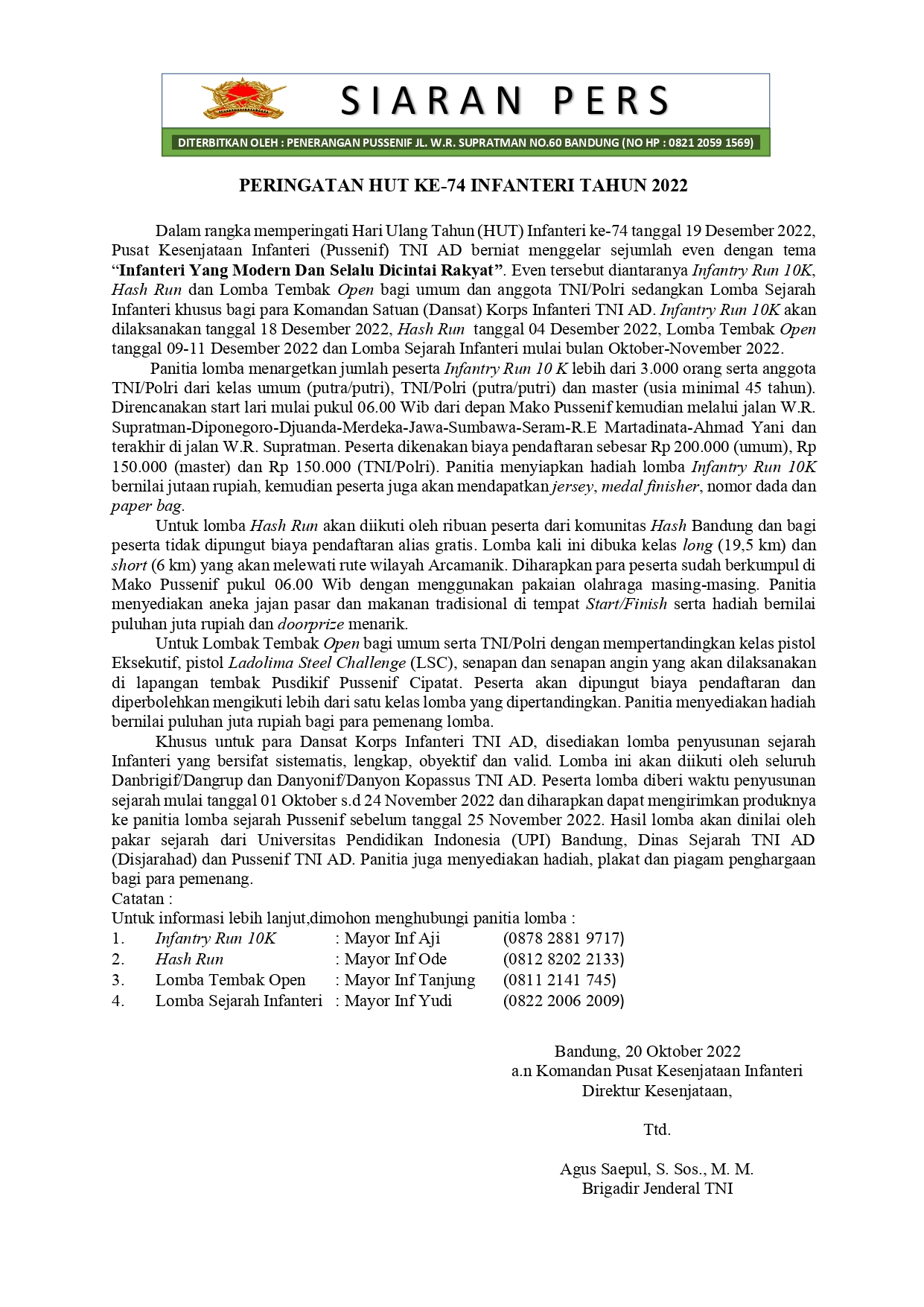 Dalam rangka memperingati Hari Ulang Tahun (HUT) Infanteri ke-74 tanggal 19 Desember 2022, Pusat Kesenjataan Infanteri (Pussenif) TNI AD berniat menggelar sejumlah even dengan tema “Infanteri Yang Modern Dan Selalu Dicintai Rakyat”. Even tersebut diantaranya Infantry Run 10K, Hash Run dan Lomba Tembak Open bagi umum dan anggota TNI/Polri sedangkan Lomba Sejarah Infanteri khusus bagi para Komandan Satuan (Dansat) Korps Infanteri TNI AD. Infantry Run 10K akan dilaksanakan tanggal 18 Desember 2022, Hash Run tanggal 04 Desember 2022, Lomba Tembak Open tanggal 09-11 Desember 2022 dan Lomba Sejarah Infanteri mulai bulan Oktober-November 2022.