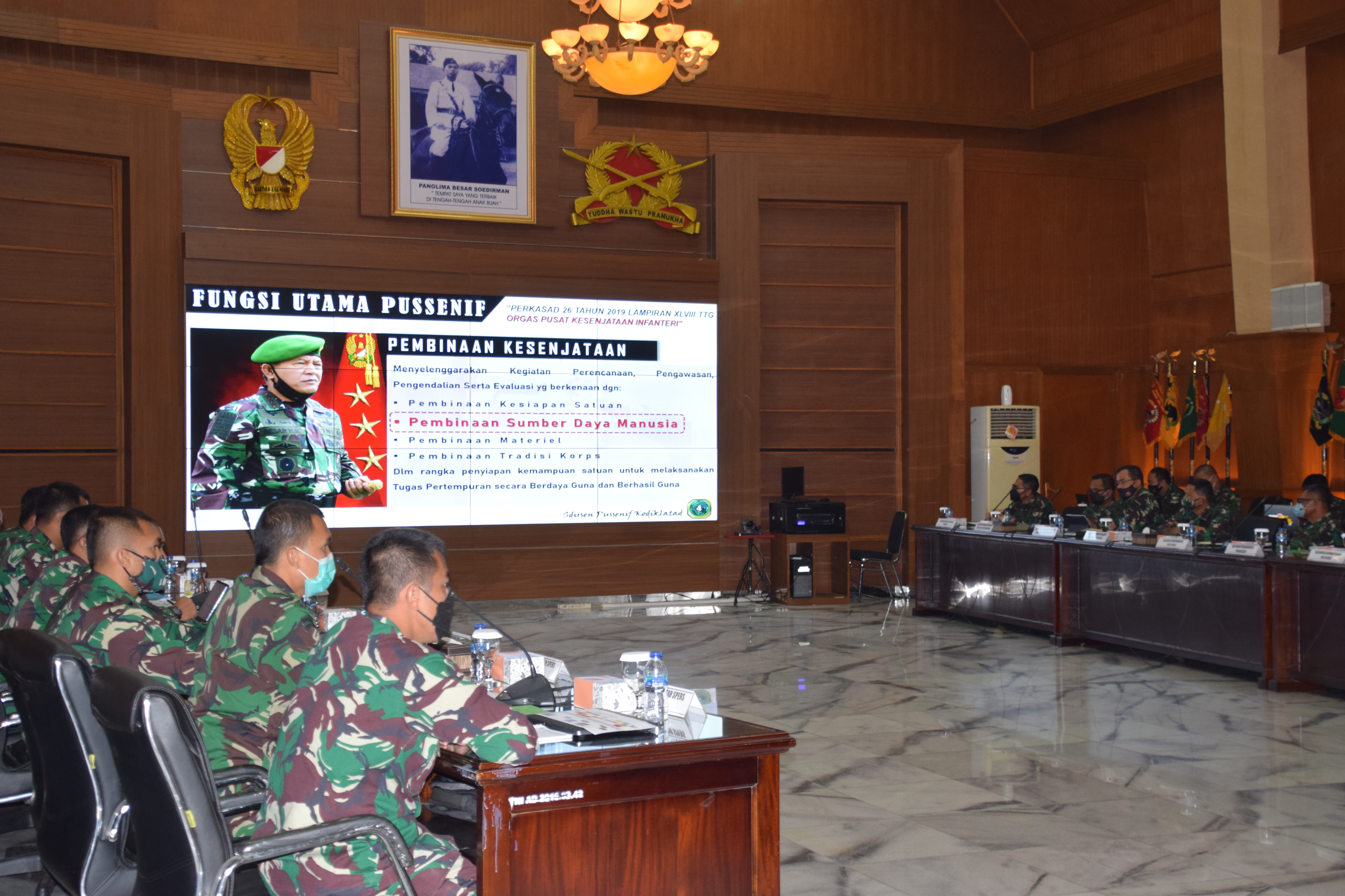 Bandung. Komandan Pussenif Letjen TNI Besar Harto Karyawan, S.H. M.Tr.(Han) memimpin Rapat Koordinasi awal program kerja Sdirsen Pussenif TA. 2021 khususnya pemilihan bakal calon Danyonif pada semester I TA. 2021, berlangsung di gedung Ahmad Yani Mako Pussenif Jumat (15/1/2020) dengan dihadiri Irpussenif, Dirsen Pussenif, Paban V/Binkar Spersad, para Pejabat Balakpus, Para Pejabat Kasubditbinmantrakorps Kecabangan dan Para Pejabat Pabandya Binkar Kodam.
