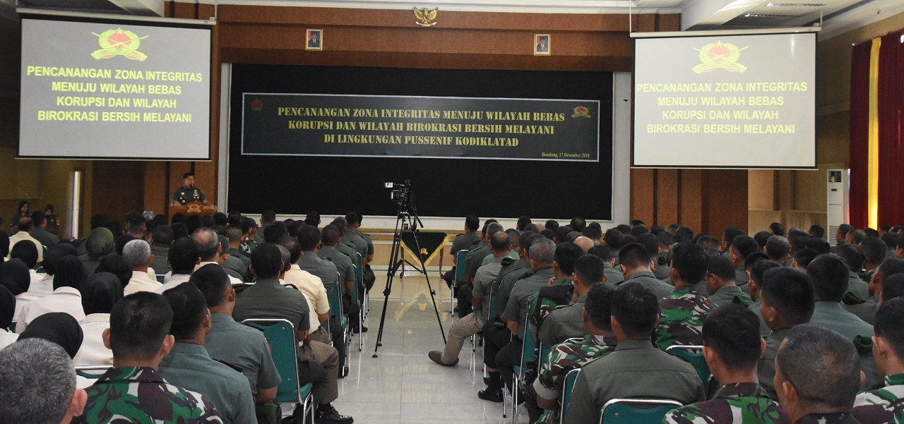 Danpussenif Kodiklatad mengungkapkan, pencanangan ini merupakan tindaklanjut dari komitmen Kepala Staf Angkatan Darat tentang membangun Zona Integritas (ZI) dan menyiapkan satuan kerja menuju Wilayah Bebas Korupsi (WBK) dan Wilayah Birokrasi Bersih dan Melayani (WBBM). “Zona Integritas merupakan predikat yang diberikan kepada instansi pemerintah, dimana pimpinan dan jajarannya mempunyai komitmen yang kuat untuk mewujudkan wilayah bebas korupsi dan wilayah birokrasi bersih dan melayani, melalui reformasi birokrasi, khususnya dalam pencegahan korupsi dan peningkatan kualitas pelayanan publik,” ungkap Mayjen TNI Teguh Pudjo Rumekso.