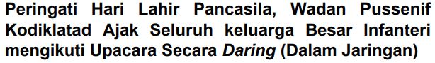 BANDUNG, Setiap 1 Juni diperingati sebagai hari lahir pancasila. Di hari lahir Pancasila tahun ini yang bertepatan di hari ini, Senin 1 Juni 2020, Wadan Pussenif Kodiklatad Mayor Jenderal TNI A. Daniel Chardin,S.E., M.Si mengajak seluruh keluarga Besar Infanteri mengibarkan bendera merah putih selama sehari dan mengikuti Upacara secara Daring. Menindak lanjuti surat perintah Panglima TNI No: B/1878-08/01/08/Spers tentang pedoman peringatan Hari Lahir Pancasila tahun 2020 Wadan Pussenif Kodiklatad mengajak seluruh keluarga Besar Infanteri mengikuti Upacara Hari Lahir Pancasila tahun 2020 melalui TVRI maupun media online lainnya. Dia menginformasikan bahwa upacara Hari Lahir Pancasila itu dapat diikuti dengan menyaksikan siaran langsung TVRI atau tayangan langsung dalam jaringan (daring) di akun akun Youtube Penerangan Pussenif, website pussenif, dan Instagram BPIP RI mulai pukul 07.45 WIB. "Semua keluarga besar Infanteri wajib mengikuti peringatan Hari Lahir Pancasila tanggal 1 Juni 2020 dimulai Pukul 07.45 melalui siaran langsung di TVRI, akun Youtube Penerangan Pussenif, website pussenif, dan Instagram BPIP RI dari kantor, ruang kerja, rumah atau tempat tinggal masing-masing," ujar Daniel Chardin